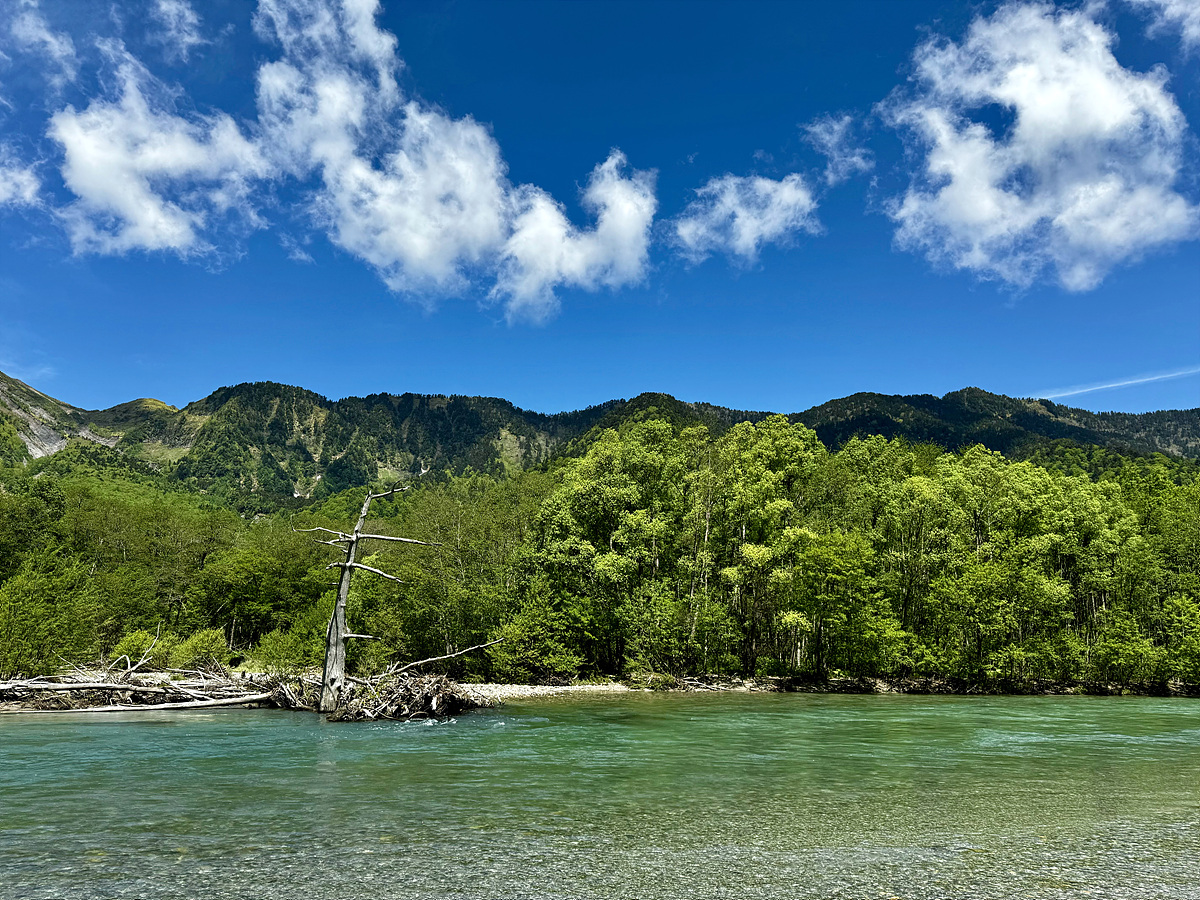 트레일은 왼쪽에 아즈사 강을 두고 숲속으로 이어진다..